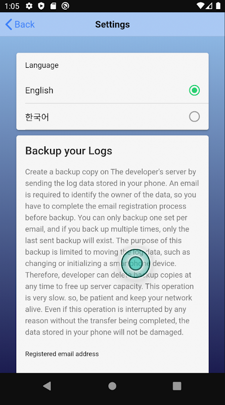 Bạn có thể sao lưu tạm thời dữ liệu nhật ký của mình trên máy chủ của nhà phát triển trong Màn hình Cài đặt (bằng cách nhấn vào biểu tượng bánh răng ở màn hình đầu tiên).