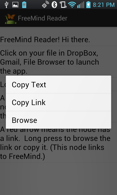 Miễn phí, không có quảng cáo. Có bản đồ tâm trí FreeMind của bạn với bạn! Ứng dụng này hiển thị FreeMind "mm". Tập tin từ trình duyệt tập tin của bạn, Gmail, Email, Dropbox, Google lái xe, vv .. Long nhấn một nút để sao chép văn bản và cho các nút có liên kết, bạn có thể sao chép liên kết hoặc duyệt nó trực tiếp trên thiết bị của bạn.