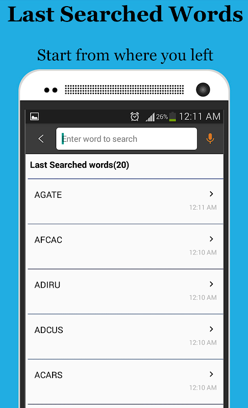 • You can see your last search words with time of searched, on main screen and can check meaning any time.