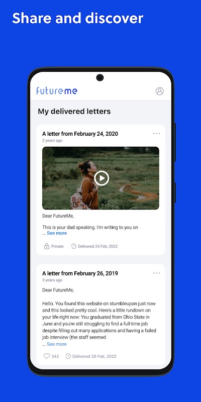 Ứng dụng FutureMe cho phép bạn viết, lên lịch và gửi thư cho chính mình, bạn bè và các thành viên gia đình trong tương lai — và đảm bảo rằng chúng được gửi đúng hạn!