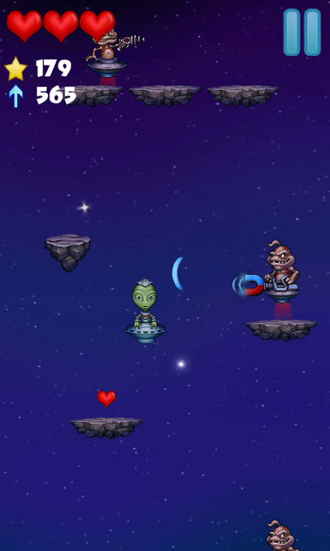 Overcome the asteroid belt on flying saucer watching out enemies. Use power-ups allows faster and jump higher, Become the best pilot in the Galactic Jump!