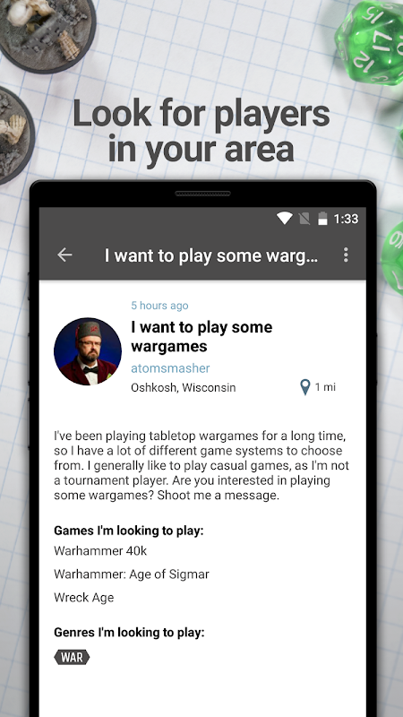 Game Finder: Search for tabletop gaming events happening in your area, or check ahead in other areas if you’ll be traveling soon. Filter by distance and game type, read full descriptions of events, sign up for events, ask questions of the host, and chat with other people interested in the event.