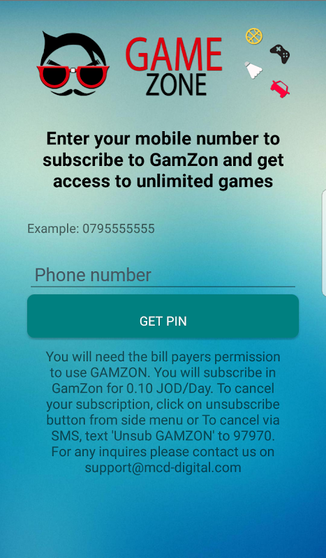 You will need the bill payers permission to use GAMZON. You will subscribe in GamZon for 0.10 JOD/Day. To cancel your subscription, click on unsubscribe button from side menu or To cancel via SMS, text \'Unsub GAMZON\' to 97970. For any inquiries please contact us on [email protected]