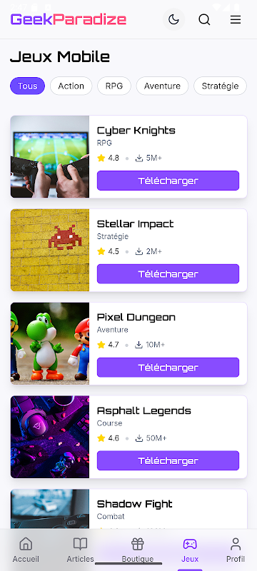 Phần Trò chơi dành cho thiết bị di động đã được thiết kế lại hoàn toàn với các bộ lọc theo thể loại (Hành động, RPG, Phiêu lưu, Chiến lược), xếp hạng hiển thị và các nút tải xuống dễ tiếp cận hơn. Bảng trò chơi hiện hiển thị rõ ràng xếp hạng và số lượt tải xuống.