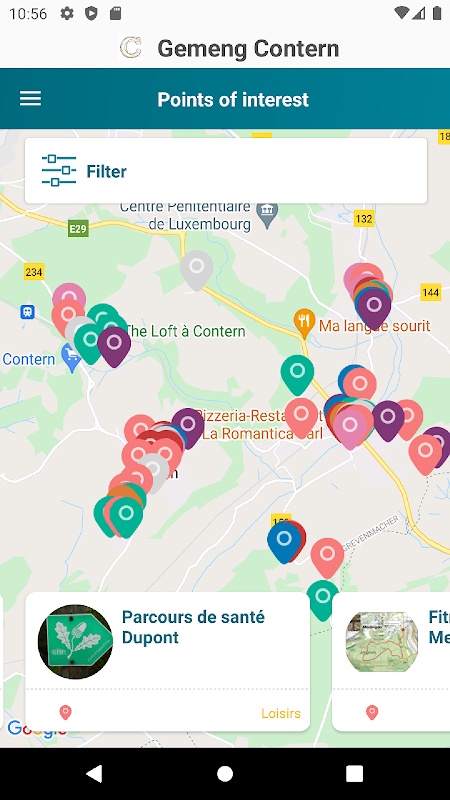 Bằng cách tải xuống ứng dụng di động mới của xã Contern, giờ đây bạn có thể dễ dàng truy cập vào tin tức và chương trình nghị sự của chúng tôi bao gồm các sự kiện khác nhau trong và xung quanh xã của chúng tôi. Trong khi đó, một bản đồ tích hợp với nhiều điểm ưa thích trong các danh mục khác nhau sẽ giúp bạn tìm thấy chính xác những gì bạn cần. Bạn cũng có thể tìm thấy thông tin về tất cả các tuyến xe buýt và xe lửa.