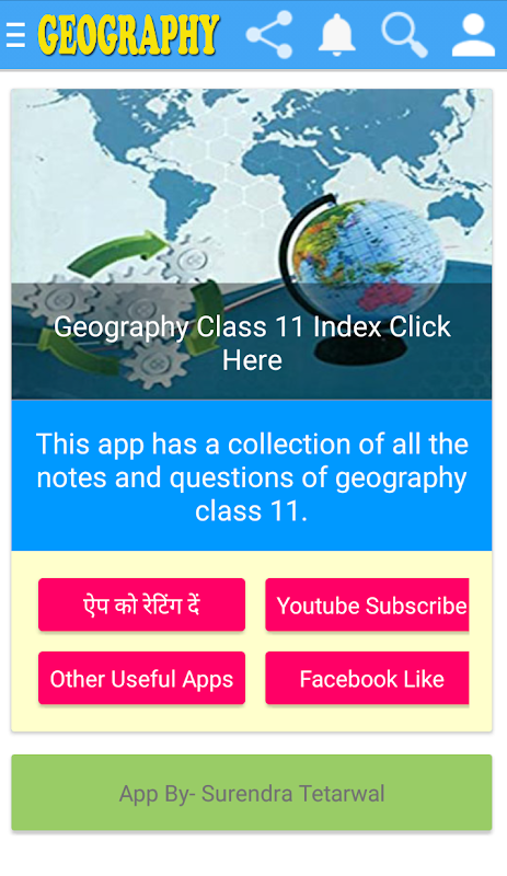 Ứng dụng chứa các giải pháp của tất cả các chương của Địa lý NCERT cho lớp XI. Nó chứa một số câu hỏi mẫu giấy tờ và chương trả lời câu hỏi khôn ngoan. Ứng dụng này có giao diện người dùng rất đơn giản.