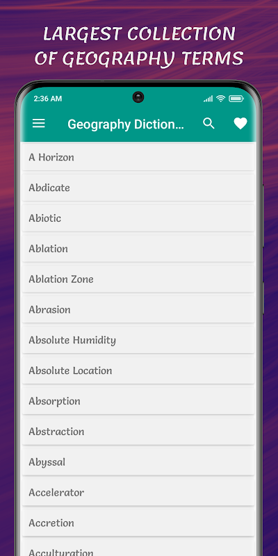 Ứng dụng từ điển địa lý cung cấp cho bạn hàng ngàn thuật ngữ địa lý cũng như các định nghĩa và ý nghĩa tương ứng của chúng.