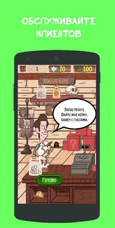 Вам предстоит занять место Босса в самой знаменитой Лавке Чудес Гравити Фолз и вести все дела самому. Не бойтесь остаться одним, ведь у вас есть надежные помощники Диппер и Мейбл. Отправляйте их на поиски ресурсов для ваших товаров. Пытайтесь угадить каждому клиенту, потому что в таком бизнесе главное хорошее обращение с людьми. И главное не жульничайте, а то если вас поймают придется платить большой штраф. Приятной игры.