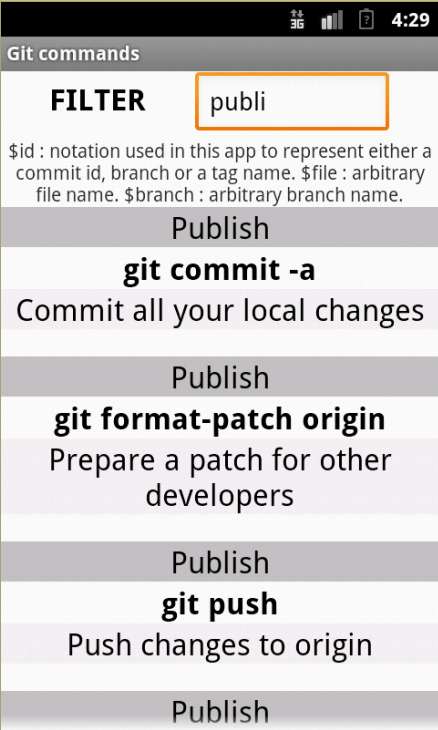 A list of GIT commands which you can filter based on text entered.