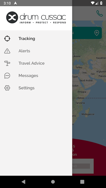 ứng dụng điện thoại thông minh của chúng tôi đối với khách du lịch cho phép họ theo dõi và xác nhận vị trí của họ dựa trên các giao thức của công ty đã được thống nhất trước, truy cập nước thông tin cụ thể và trí thông minh và cung cấp một huyết mạch 24/7 với Trung tâm Điều hành Drum Cussac toàn cầu hoặc một trung tâm cuộc gọi thay thế cho trước chuyến đi tư vấn và hỗ trợ khẩn cấp.