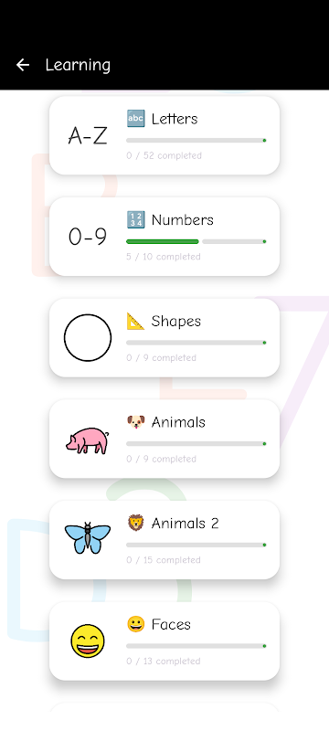 Ứng dụng có nhiều phần học tập, bao gồm chữ cái viết hoa và viết thường, số và hình khối, rất phù hợp cho người mới học. Mỗi danh mục được thiết kế với tính năng theo dõi có hướng dẫn để củng cố thói quen viết đúng.