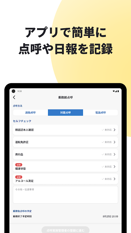 Ứng dụng này là một ứng dụng để thực hiện việc điểm danh các tài xế lái xe thương mại.