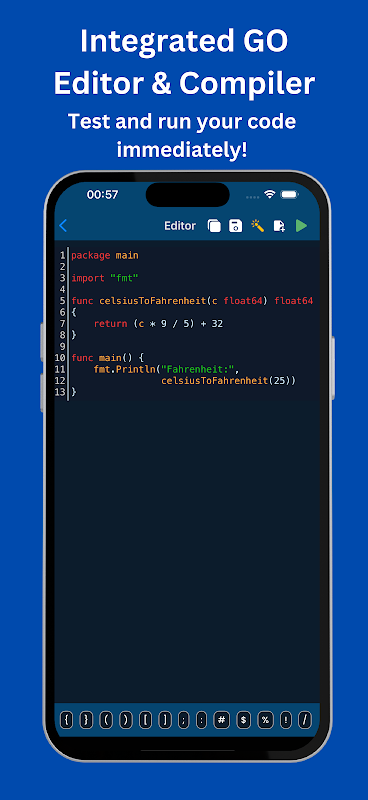 IDE tích hợp: Viết, kiểm tra và chạy mã Go trực tiếp trong ứng dụng! Mobile Go IDE tích hợp giúp bạn dễ dàng viết mã mọi lúc, mọi nơi, ngay từ thiết bị di động của bạn, khiến nó trở nên hoàn hảo cho những ai muốn học Go khi đang di chuyển.