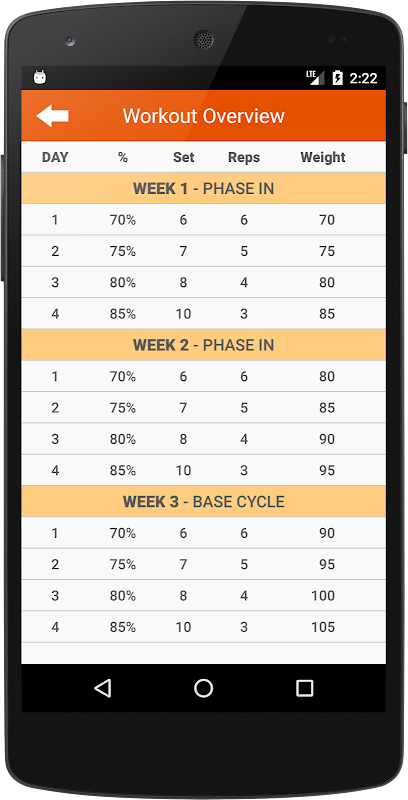 This app calculates your numbers based on your 1-RM entry and you're good to go. All daily and weekly numbers will auto-populate for ease of use.
