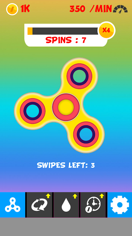 Go spinner go! is a Spinner Game is a Game in which you swipe or spin the fidget with your finger and wait till it stops spinning, you will get rewarded for each complete spin then you can upgrade your fidget spinner, are allowed to 5 swipes / spins in each game.