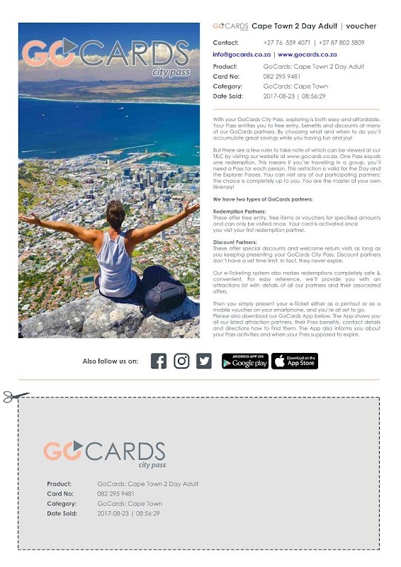 GoCards is a Smartphone App for a City Pass for the tourist destination Cape Town/South Africa and for other destinations in South Africa running on the basis of an e-ticket system. The App is meant to be a city guide which shows the e-ticket purchasers which and where the attractions are they can visit with the pass. The App also shows what the benefits are at each attraction. At the same time this App will also give all the attractions suppliers the opportunity to redeem the client’s e-tickets at the point of entrance to get recognized for their pay-backs. This app will also allow a “mobile” selling opportunity for all the sales agents for GoCards especially if they don’t have access to a laptop or a computer at the Point of Sale.