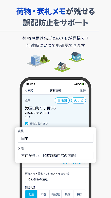 Ứng dụng này ghim thông tin gói hàng lên bản đồ khu dân cư Zenrin, hiển thị tên tòa nhà và biển hiệu, đồng thời cho phép bạn so sánh thông tin gói hàng với bản đồ khu dân cư. Ứng dụng giúp bạn lập kế hoạch tuyến đường giao hàng và ngăn ngừa giao hàng nhầm.