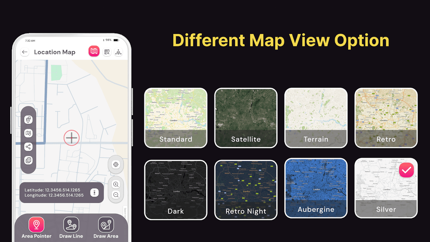 - Nhiều lớp bản đồ: Chọn từ nhiều chế độ xem bản đồ khác nhau, bao gồm Tiêu chuẩn, Vệ tinh, Địa hình, Cổ điển, Tối, Đêm cổ điển, Cà tím và Bạc, để phù hợp với sở thích và nhu cầu của bạn.