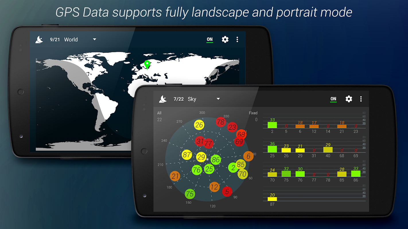 1) Tab bầu trời + chế độ xem tín hiệu - chế độ xem bản đồ bầu trời trình bày vị trí của các vệ tinh được kết nối với thiết bị trên bầu trời. Mỗi vòng tròn nhỏ đại diện cho một vệ tinh với màu sắc phù hợp với cường độ tín hiệu và trạng thái của nó. Vòng tròn bản đồ bầu trời được xoay tùy thuộc vào la bàn của thiết bị. Chế độ xem cường độ tín hiệu trình bày biểu đồ cường độ của các vệ tinh được kết nối với thiết bị. Mỗi thanh đại diện cho một vệ tinh, chiều cao của thanh tỷ lệ với cường độ tín hiệu nhận được.