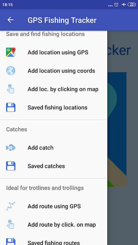 6. Bạn có thể lưu và quản lý vị trí câu cá của mình (trong thời gian thực bằng cách sử dụng nhà cung cấp GPS hoặc sử dụng tọa độ hoặc bằng cách nhấp vào bản đồ). Hơn nữa, bạn có thể điều hướng đến một địa điểm câu cá cụ thể.