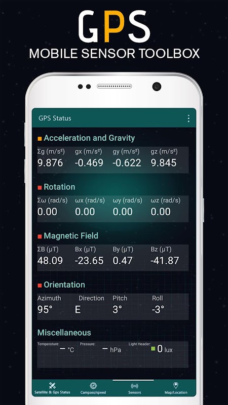 Trạng thái kiểm tra GPS multi toolbox Sensor finder giúp bạn cho bạn biết có bao nhiêu cảm biến có sẵn trên thiết bị của bạn. Kiểm tra GPS ứng dụng bước truy cập có được danh sách cảm biến thực tế gia tốc và tất cả các cảm biến khác có sẵn trong công cụ ứng dụng thử nghiệm trạng thái này cũng tìm thấy ánh sáng, máy dò từ kim loại lân cận của bạn chạy khóa truy cập bước bảo mật đó là giúp bạn dễ dàng tìm thấy hướng Qibla la bàn. Trạng thái tìm kiếm tuyến đường công cụ GPS và chế độ xem giao thông trong thời gian thực trong bản đồ là một ứng dụng độc quyền để tin tưởng vào các tình huống dựa trên thời gian thực và trạng thái lưu lượng truy cập trực tiếp với điều hướng.