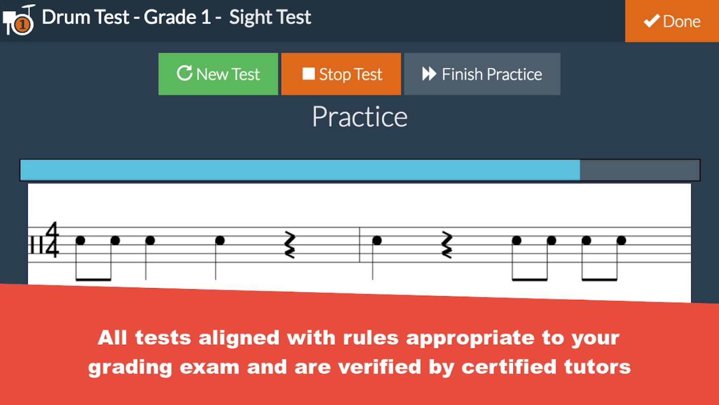 The ear and sight reading tests are a daunting aspect of your exam. Unlike the performance pieces and technical exercises you don't know what to expect so they can be difficult to practice for, especially without a tutor. Using the expert knowledge of our certified North London Drums tutors, the app will produce an infinite number of sight reading and ear tests examples, all within the rules and difficulty appropriate for your grade.