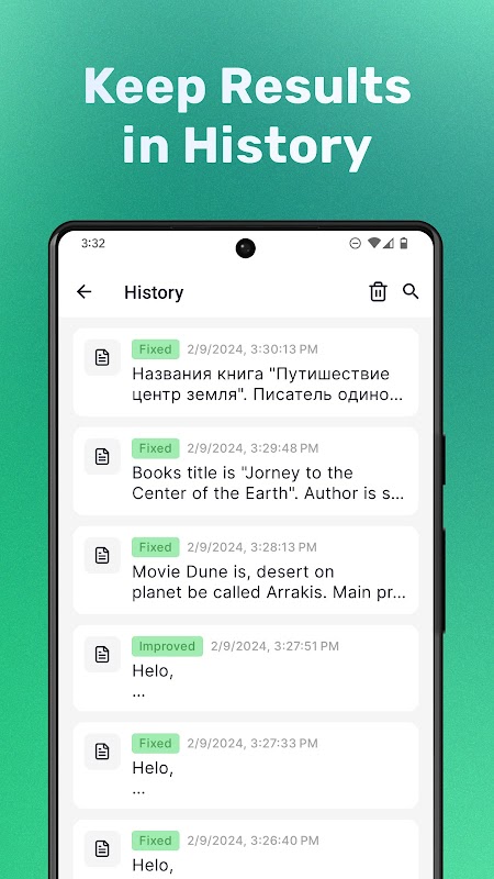 - Lịch sử: Theo dõi hành trình ngôn ngữ của bạn bằng tính năng "Lịch sử" trong ứng dụng của chúng tôi. Ghi nhớ mọi văn bản cố định, theo dõi những thay đổi và hiểu rõ những cải tiến, từ đó đẩy nhanh quá trình học tập của bạn.