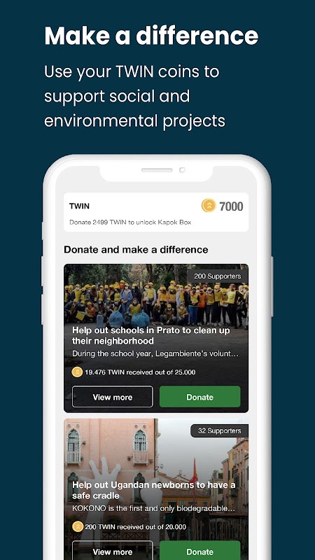 Tạo nên sự khác biệt! Sử dụng xu TWIN để hỗ trợ các sáng kiến về môi trường và xã hội trong phần Quyên góp.