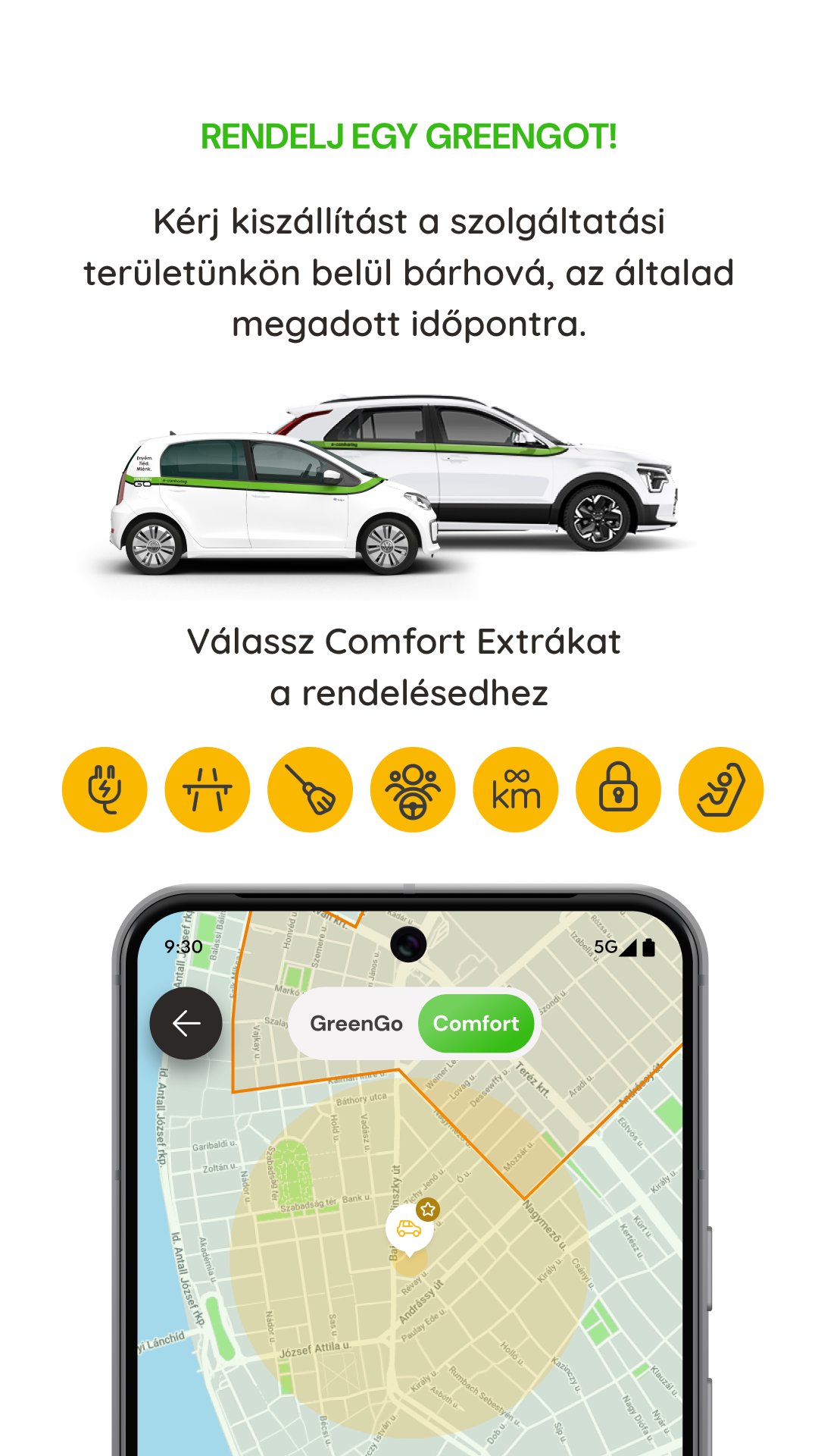 • Trong dịch vụ GreenGo Comfort, bạn cũng có thể tìm thấy các mẫu xe rộng rãi, tầm hoạt động xa hơn cho những chuyến đi dài, thuê nhiều ngày và bạn có thể sử dụng cùng một chiếc xe tối đa 20 ngày. Bạn cũng có thể chọn các tiện ích bổ sung khác nhau cho đơn đặt hàng GreenGo Comfort của mình, với các tiện ích này bạn có thể thêm người lái bổ sung vào hợp đồng thuê, yêu cầu ghế trẻ em hoặc số km miễn phí không giới hạn. • Đặt và thuê GreenGo Cargos với sức chứa lớn để vận chuyển hàng hóa theo giờ và theo ngày