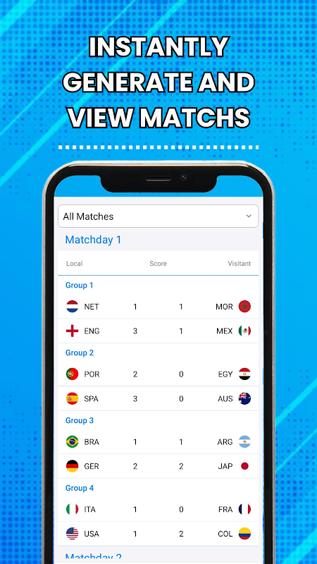 Xem toàn bộ trận đấu hoặc theo nhóm, kiểm tra bảng xếp hạng được cập nhật tức thì, truy cập bảng đấu loại trực tiếp và xem tóm tắt trận đấu, đội hình và kết quả chi tiết.
