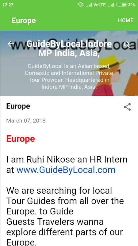 GuideByLocal.com is bringing you something unknown and unheard. Seeing and travelling through a new spot with the eyes of a local. Yes, you read it right. We will be providing you with the raw and unmatched experience of getting the first-hand feel of a place through the eyes of a local. GuideByLocal.com will be your first stop to locate something which will help you to get a feel for the spot you are travelling without any Adulterations. We will be providing you with the pure and blissful experience of being the part of a place where you are travelling with the help of our local guides. We have a full-fledged directory of local guides through which you can get a unique and never-seen-before experience of the place you are travelling. http://www.guidebylocal.com/2018/03/guidebylocal.html