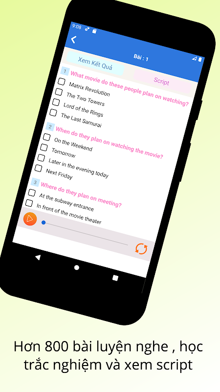 Được chúng tôi thiết kế rất khoa học biên soạn từ dễ đến khó.Giúp bạn cải thiện kỹ năng nghe của mình khi vừa nghe vừa trả lời các câu hỏi trắc nghiệm trong bài nghe. Và đặc biệt có script của mỗi bài giúp bạn kiểm tra và luyện tập lại một cách thật dễ dàng nhất.