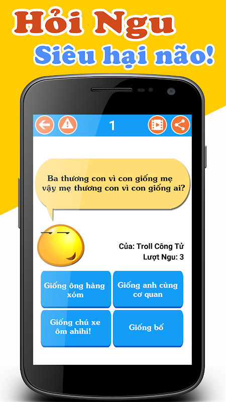 Hoi Ngu – Hỏi Ngu Hại Não (Hoi ngu - Hoi ti - Hỏi Ngu) là game troll với kho câu hỏi ngu vô cùng đa dạng, phong phú và hấp dẫn. Game hoi ngu giúp bạn rèn luyện khả năng ứng biến với các câu hỏi ngu để trở thành Thánh Troll.