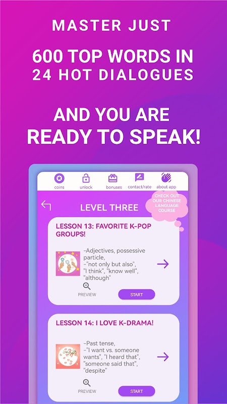 Tài liệu đã được sắp xếp thành 20 đoạn hội thoại thú vị để làm cho việc học trở nên sinh động và ý nghĩa nhất có thể! Sau khóa học, người dùng sẽ có thể tự tin du lịch đến Hàn Quốc và có thể tương tác với người Hàn Quốc địa phương về các chủ đề hàng ngày. Hãy cài đặt để xem trước bài học!