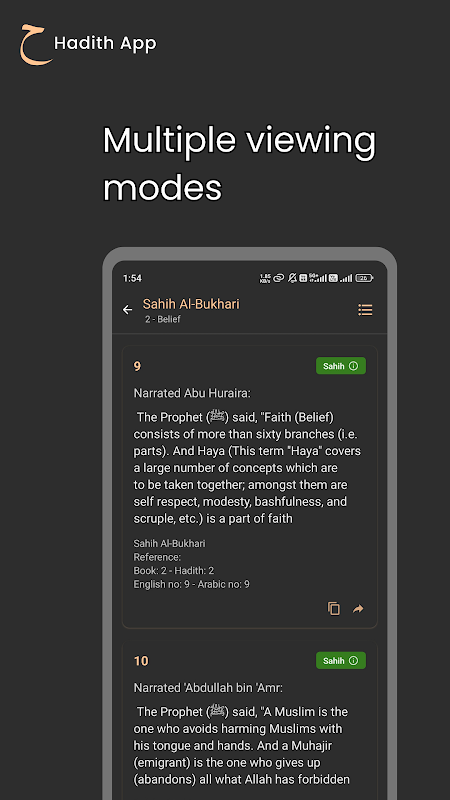 Tất cả các Hadith đều được trình bày với điểm số phù hợp và tài liệu tham khảo trong sách, đảm bảo mức độ chính xác và độ tin cậy cao nhất. Hiện tại, ứng dụng này cung cấp bản dịch tiếng Anh để dễ hiểu và chia sẻ những lời dạy vượt thời gian này.
