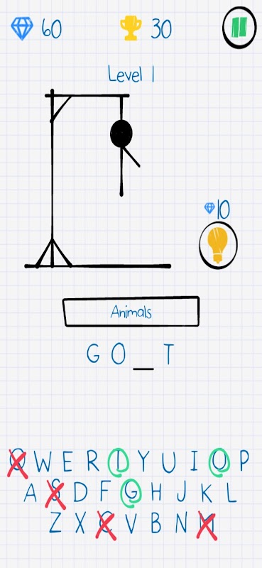 Thưởng thức trò chơi treo cổ trên điện thoại di động hoặc máy tính bảng của bạn! Trò chơi cổ điển giá treo cổ này phù hợp với mọi lứa tuổi, đặc biệt là đối với những người lớn muốn rèn luyện kỹ năng ngôn ngữ và từ vựng hoặc trẻ em đang học từ mới. Hangman cổ điển cho thiết bị của bạn. Chơi trò chơi với người que.