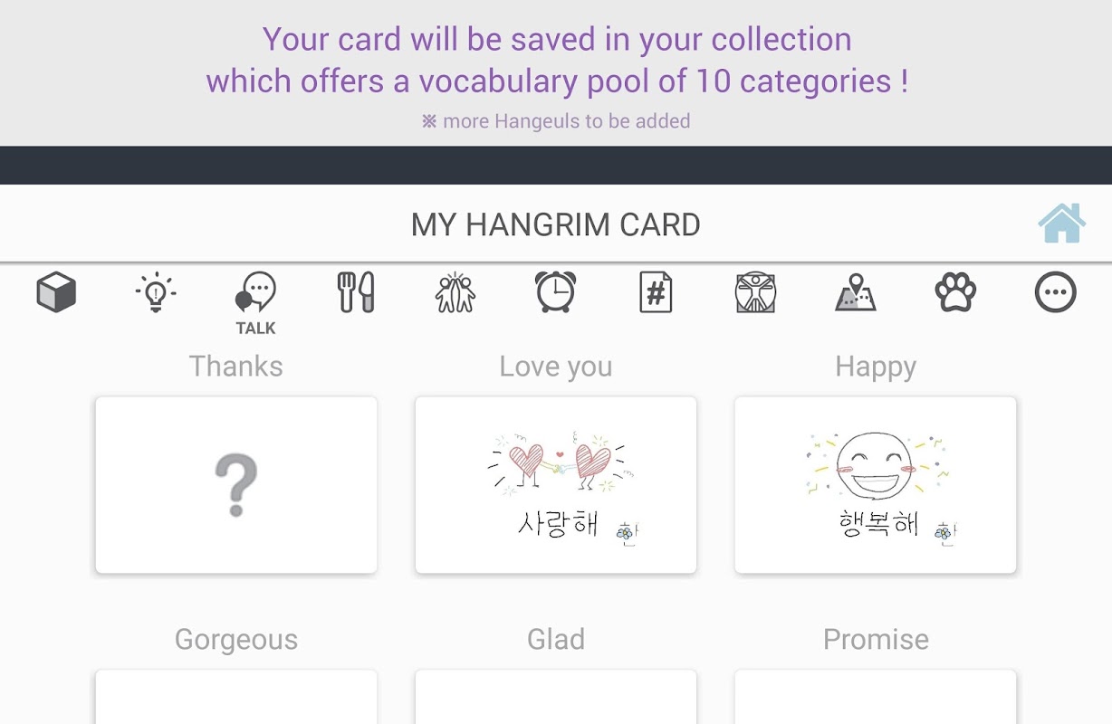 There are about 300 interesting words and short sentences of Hangeul to create your unique *HanGrim Cards* with our convenient drawing tool. By the time you complete the collection, your basic Korean will be improved immensely! (more Hangeuls to be added)