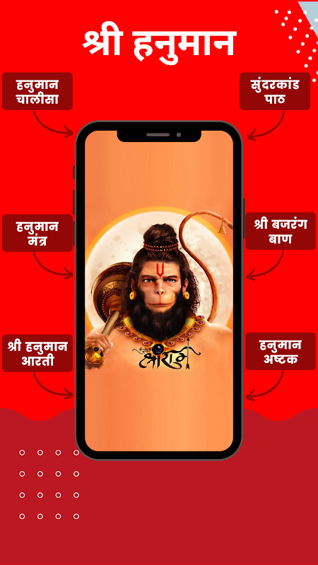 Trong ứng dụng này, bạn sẽ có thể đọc ngoại tuyến các văn bản tâm linh của đạo Hindu như Hanuman Chalisa, Sunderkand Path, Haunman Aarti, Mantra và Hanuman Ashtak.
