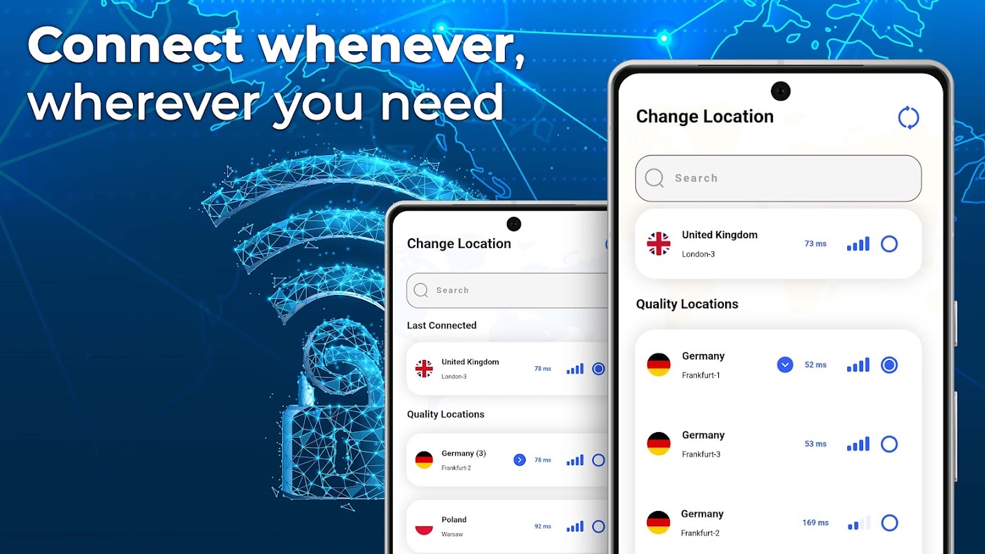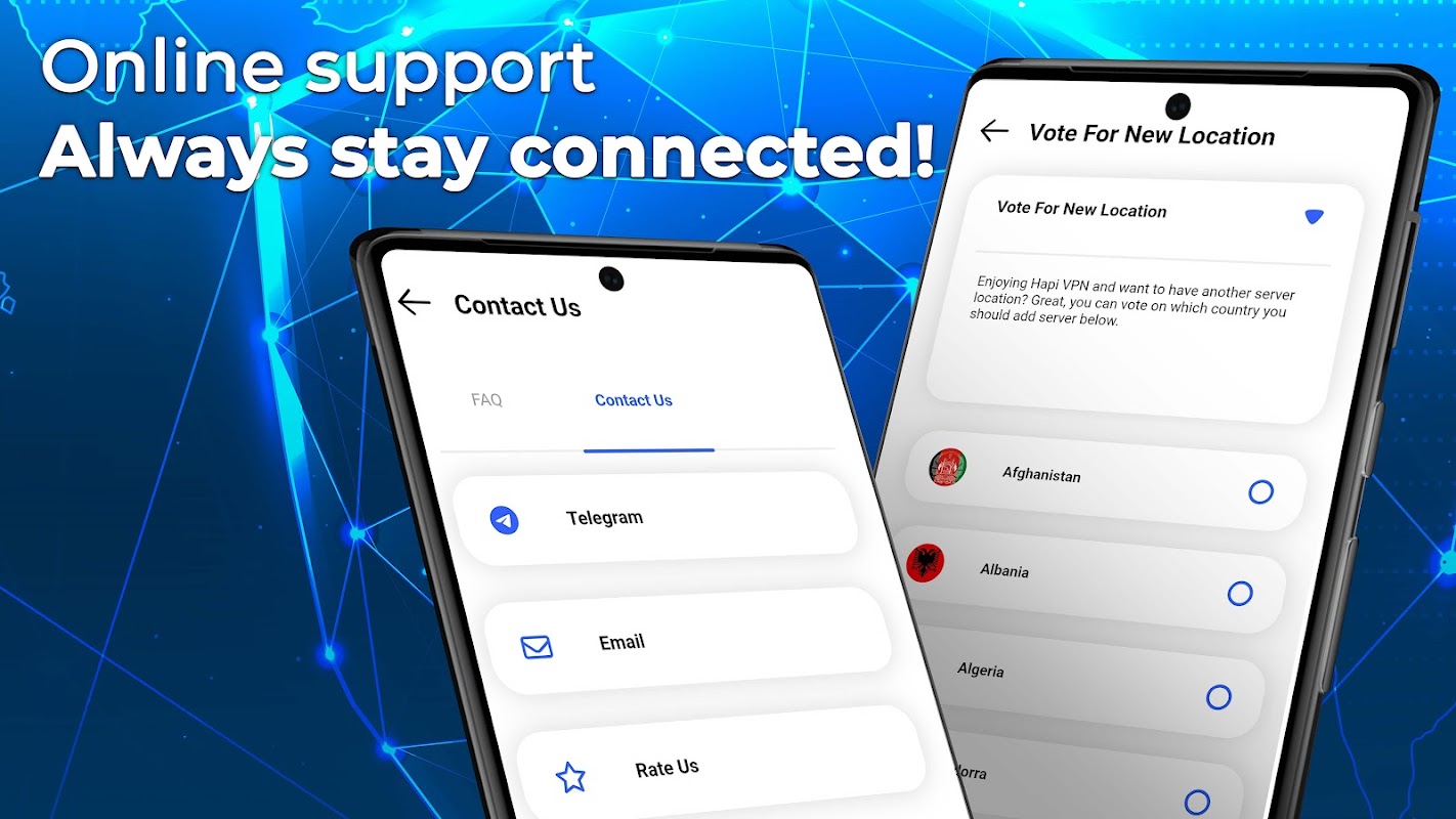Hapi VPN cung cấp các máy chủ nhanh và an toàn để bạn kết nối từ mọi nơi. Chỉ cần mở ứng dụng, chọn vị trí bạn muốn và nhấn kết nối. Hapi VPN sẽ lo phần còn lại, cho phép bạn tận hưởng kết nối VPN không giới hạn, nhanh chóng và an toàn bao lâu tùy thích. Ứng dụng sử dụng các máy chủ ẩn danh để đảm bảo an toàn và bảo vệ Internet của bạn, đồng thời không thu thập bất kỳ dữ liệu nào hoặc theo dõi hoạt động trực tuyến của bạn. Với Hapi VPN, bạn có thể tự tin duyệt internet khi biết rằng dữ liệu và danh tính của mình được bảo mật.
