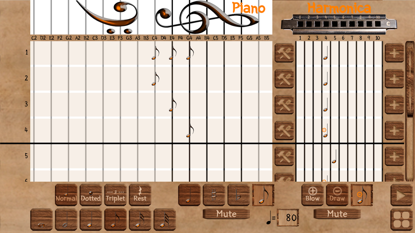 Tính năng Tạo bản nhạc: Bạn có thể tạo, lưu, mở bản nhạc của mình bằng 2 nhạc cụ: Harmonica và Piano. Xuất bản để chơi hoặc chia sẻ với mọi người.