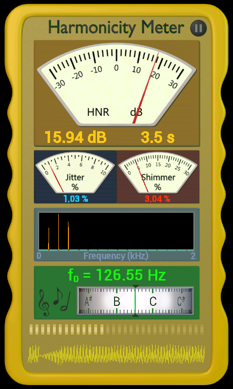 Biến đổi Fourier nhanh (kích thước 8192) được thực hiện trên 0,74 giây dữ liệu cuối cùng để tạo ra phổ tần số (0 đến 5,5 kHz với độ phân giải 1,35Hz). Phổ tần số này được hiển thị trong khoảng từ 100 đến 4 kHz với mức giảm tuyến tính xuống 0 tại 50 và 5 kHz. Tần số cơ bản được xác định từ khớp đa thức đến cực đại. Năng lượng sóng hài được xác định từ tổng tín hiệu FFT tại tần số sóng hài cộng với 8 Hz ở hai bên. Tiếng ồn là tổng của phần còn lại của FFT. Tỷ lệ hài hòa với năng lượng tiếng ồn là Độ hài hòa và được hiển thị bằng decibel.