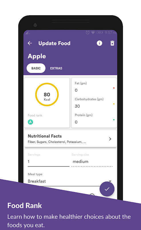 ✓ Theo dõi tất cả các chất dinh dưỡng - Calo, chất béo, protein, carbs, đường, chất xơ, cholesterol, vitamin, v.v.