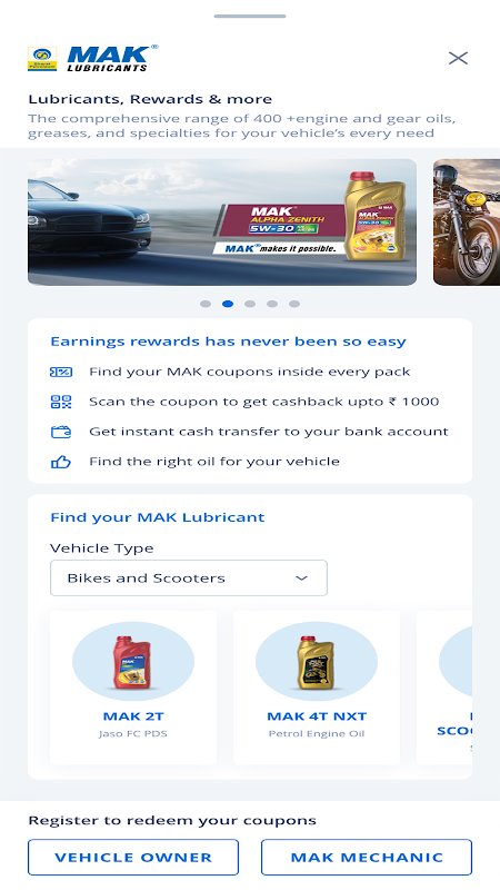 4. Khách hàng có thể quét phiếu giảm giá MAK có sẵn bên trong các gói chất bôi trơn MAK và nhận ngay khoản tiền hoàn lại lên đến 1000 Rs / - trực tiếp vào tài khoản ngân hàng của họ. Tìm loại dầu phù hợp cho xe của bạn. Thợ máy có thể đăng ký chương trình khách hàng thân thiết của BPCL dành cho thợ máy và nhận tiền hoàn lại / phần thưởng tức thì, v.v.