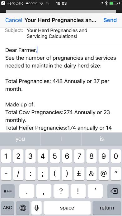 The Herd Pregnancy and Servicing Calculator app allows the user to input reproductive parameters from his herd and then calculate the required number of pregnancies and servicing per interval to maintain the herd. To begin, the user should enter the herd size, calving interval, pregnancy loss rate, culling rate and death rate. Then the user should enter the average conception rate for lactating cows and the average conception rate in virgin heifers. To obtain the data for text fields required, you may refer to a report generated by the software present at the farm.