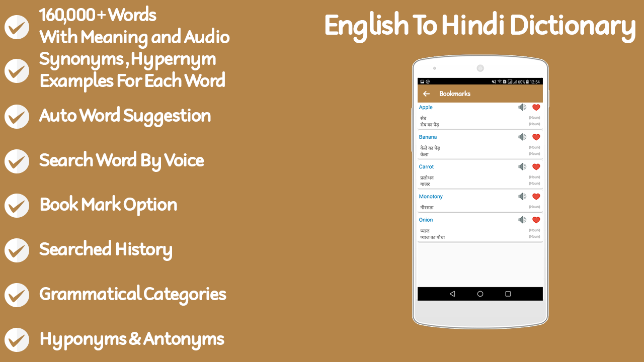 Từ điển tiếng Anh sang tiếng Hindi có một lakhs cộng với ý nghĩa từ trong tiếng Hindi và tiếng Anh. Ứng dụng này sẽ giúp bạn xây dựng vốn từ vựng bằng cả tiếng Anh và tiếng Hindi. Đây là công cụ học tập trực tuyến tốt nhất. Ứng dụng này có chức năng tự động đề xuất, có nghĩa là bạn không cần gõ từ đầy đủ. Ứng dụng này cũng cung cấp cách phát âm bằng tiếng Anh và tiếng Hindi.