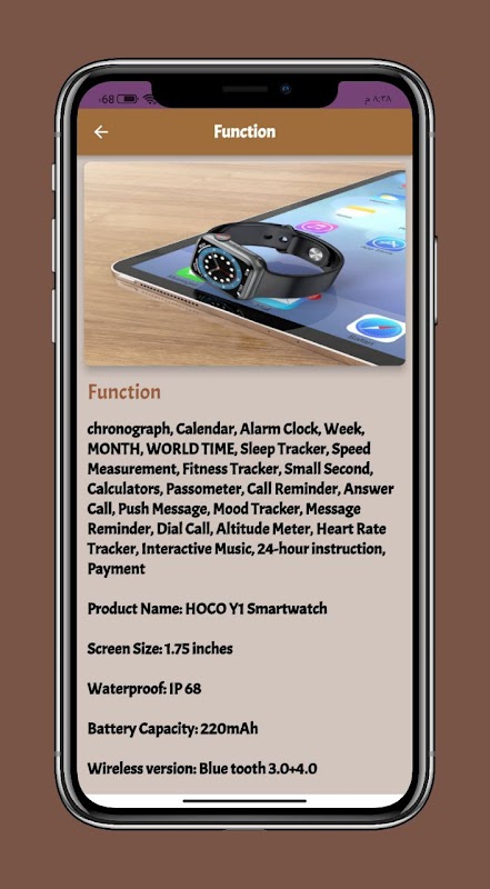 Bạn có thể tìm thấy mọi thông tin chi tiết cần thiết về Đồng hồ thông minh Hoco Y1 trong ứng dụng này.