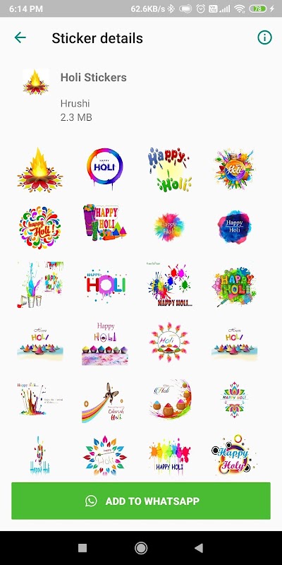 Ứng dụng Holi chứa nhiều loại nhãn dán khác nhau như Happy Holi, Dhuleti, Lễ hội màu sắc và nhiều thứ khác.