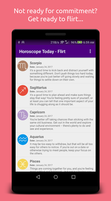 Ứng dụng Tử vi hôm nay miễn phí cho phép bạn đọc tử vi hàng ngày được cá nhân hóa. Bạn có thể đọc tử vi trong các loại sau: chung, tình yêu, tán tỉnh, sự nghiệp và tài chính.