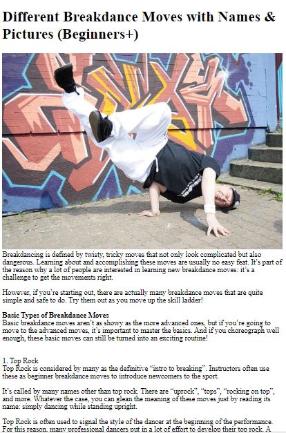 Toprock: Bắt đầu với toprock, động tác nhảy thẳng đứng được thực hiện khi đứng. Thử nghiệm các bước cơ bản như bước hai bước, bước chéo và bước Ấn Độ, tập trung vào tính trôi chảy, nhịp điệu và phong cách.