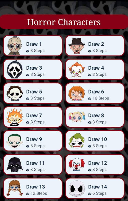 How to draw horror characters is an application that give you the chance to draw the horror characters step by step, draw and enjoy your memories , young or old , the fun is guaranteed while drawing those famous characters known by their scary and funny behaviors at the same time !!
